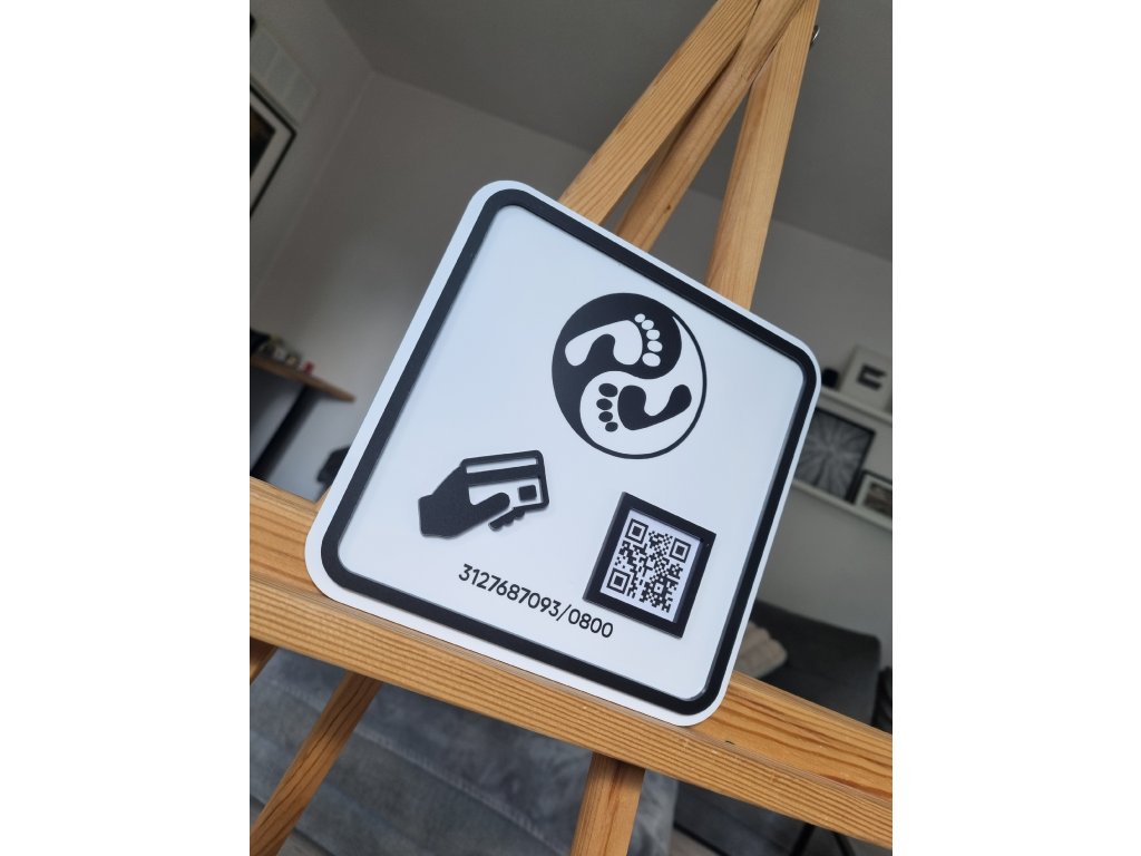Moderní cedulka s QR kódem je stylový a praktický doplněk pro každý salon, studio či kavárnu. Umožní vašim klientům snadno provést bezkontaktní platbu nebo se během vteřiny propojit s vašimi sociálními sítěmi.