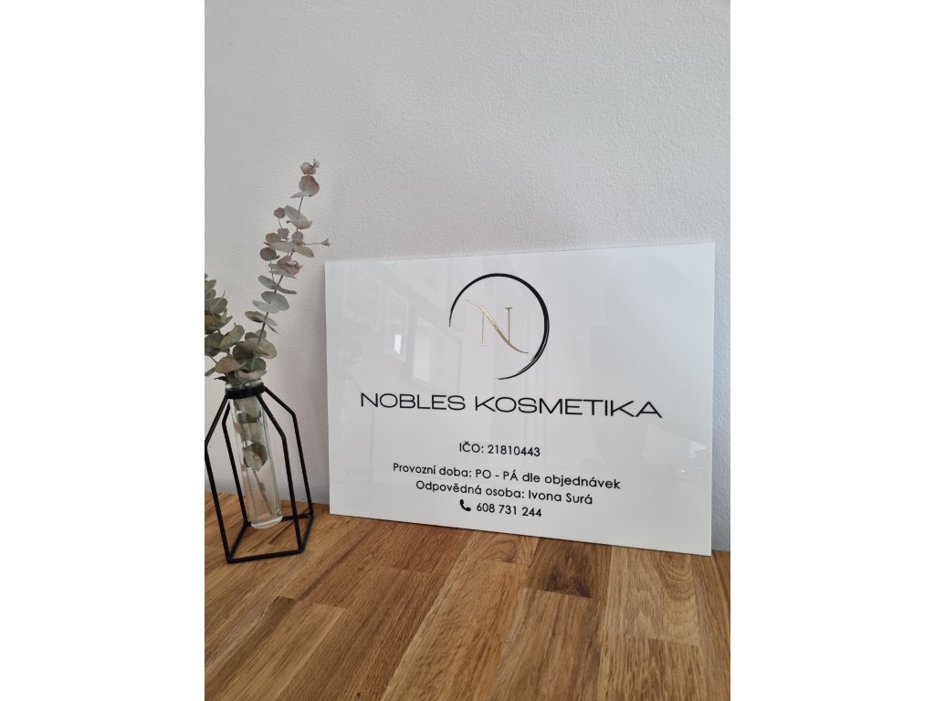 Designová informační cedulka s vinylovými nápisy a 3D plastickým logem z vrstveného plexiskla dodá vašim dveřím či recepci profesionální a stylový vzhled.