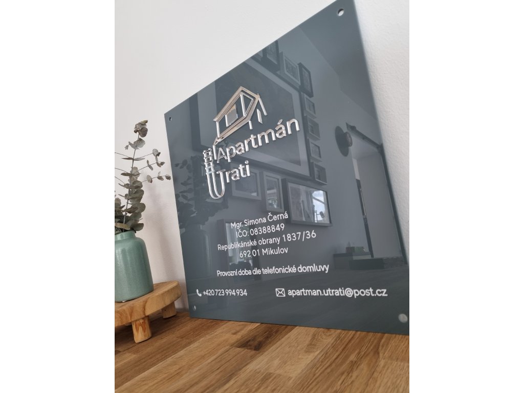 Cedulku snadno připevníte lepením nebo pomocí distančních šroubů, které působí elegantně a moderně.