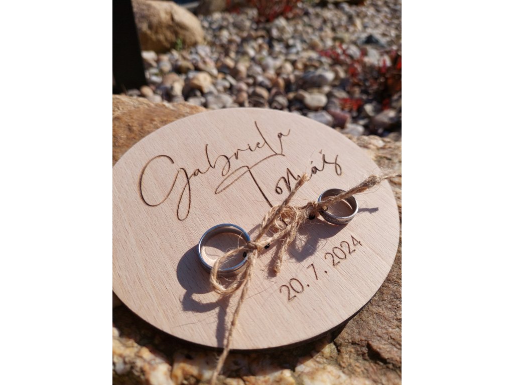 Dřevěný podnos na snubní prstýnky s gravírovanými jmény a datem svatby – elegantní a přírodní doplněk pro váš svatební obřad.