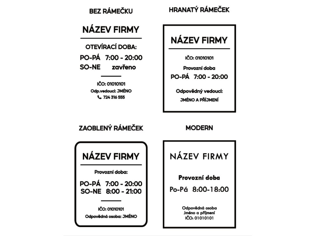 Řezaná samolepka s označením provozovny či otevírací dobou je moderní a elegantní způsob, jak označit váš salon, ordinaci či prodejnu všemi zákonem povinnými údaji. Nálepku jednoduše nalepíte na dveře nebo výlohu.