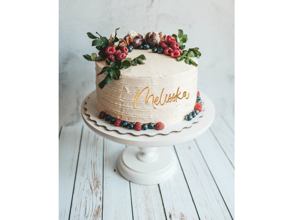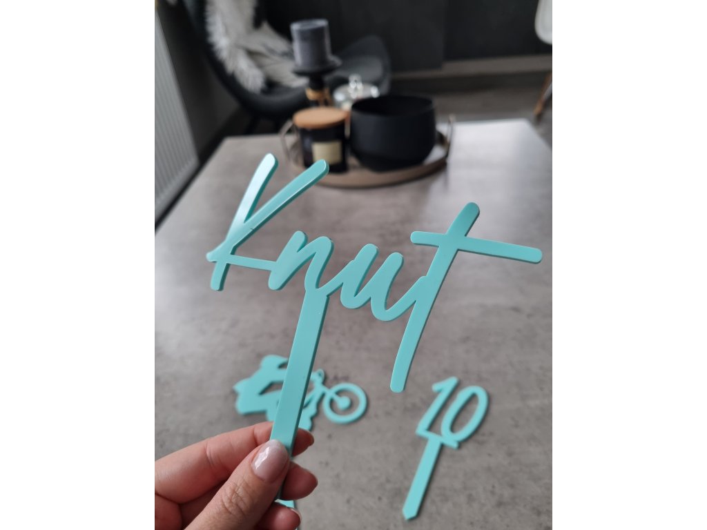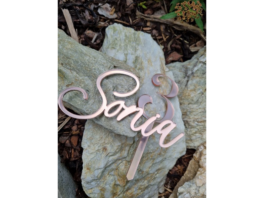 Stylové jméno na dort z plexiskla, které ozvláštní každý narozeninový či svatební dort a můžete ho používat znovu a znovu.